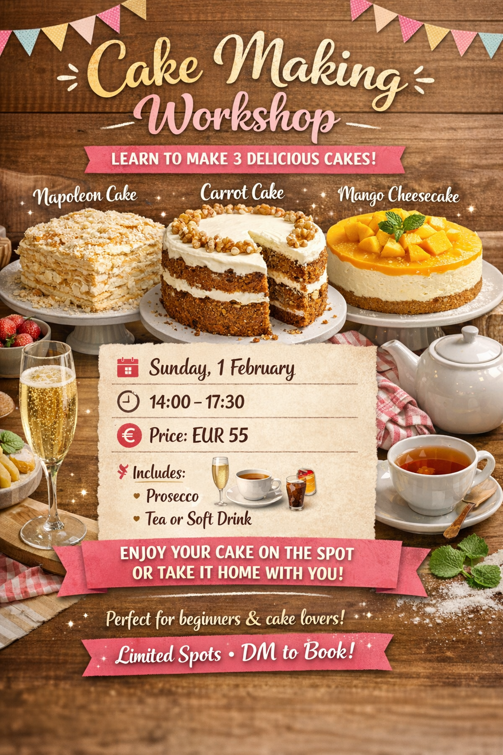 The Nest Kungla 1, TallinnJoin us for a sweet Sunday and learn how to make 3 classic & crowd-favorite cakes from scratch! 👩🍳 At the workshop you’ll create: ✨ Napoleon cake ✨ Carrot cake ✨ Mango cheesecake 📅 Date: Sunday, 1 February ⏰ Time: 14:00–17:30 💶 Price: EUR 55 🥂 Included: • Prosecco • Tea or soft drink 🍰 […]